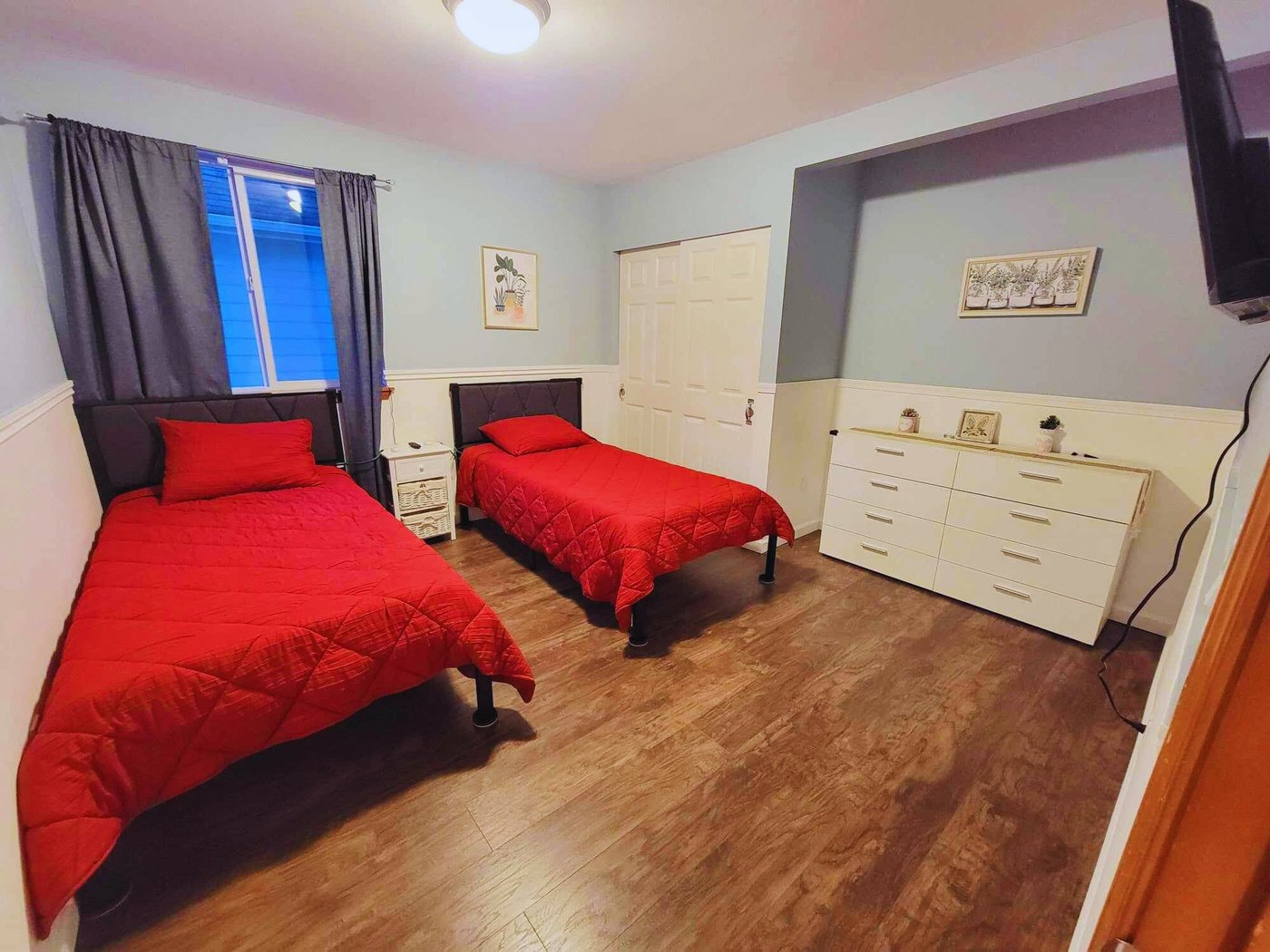 Private and shared rooms, two communal living areas, a spacious outdoor deck, and two full bathrooms.